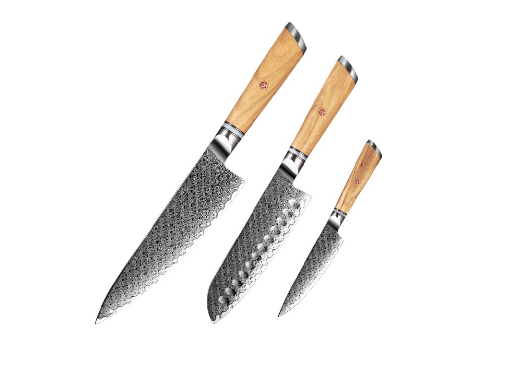 Čepele všech nožů jsou vyrobeny z 67 vrstev damaškové oceli, která je ceněná pro svou mimořádnou pevnost, odolnost a charakteristickou kresbu.