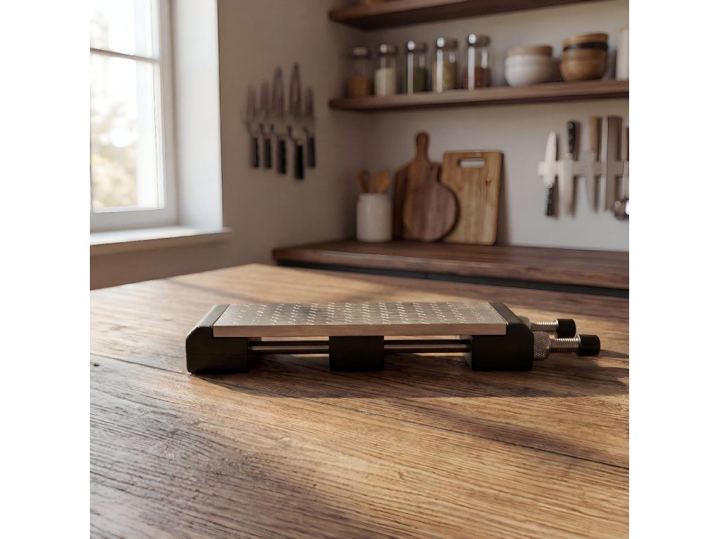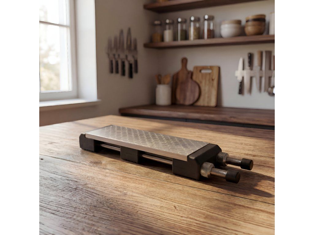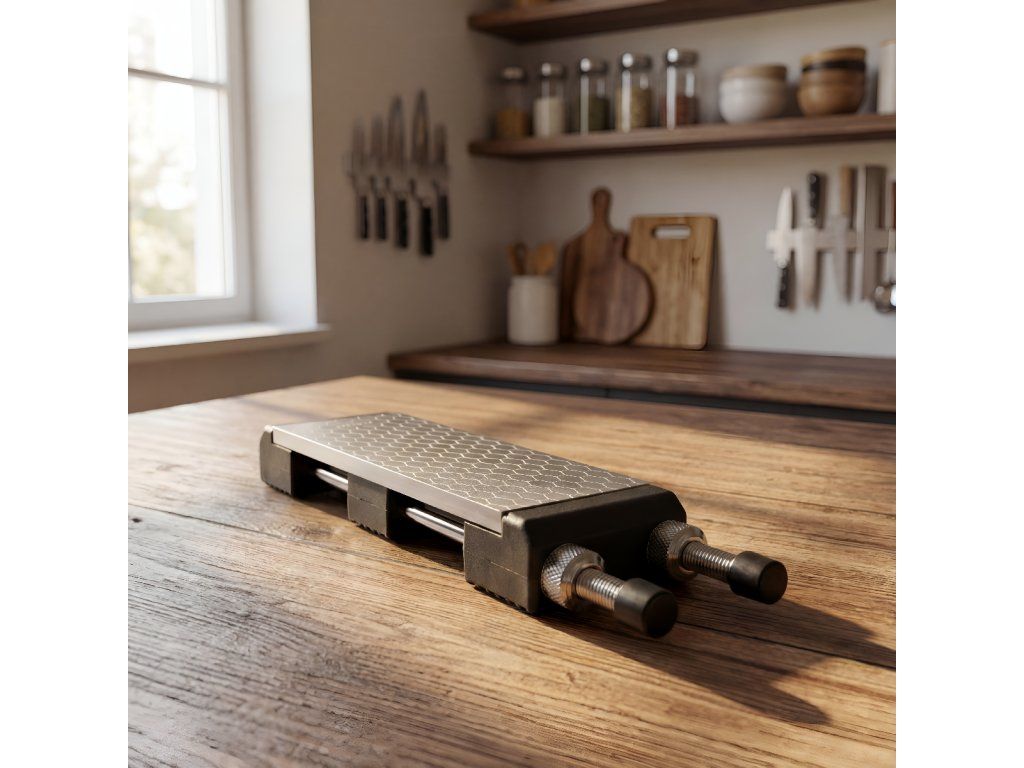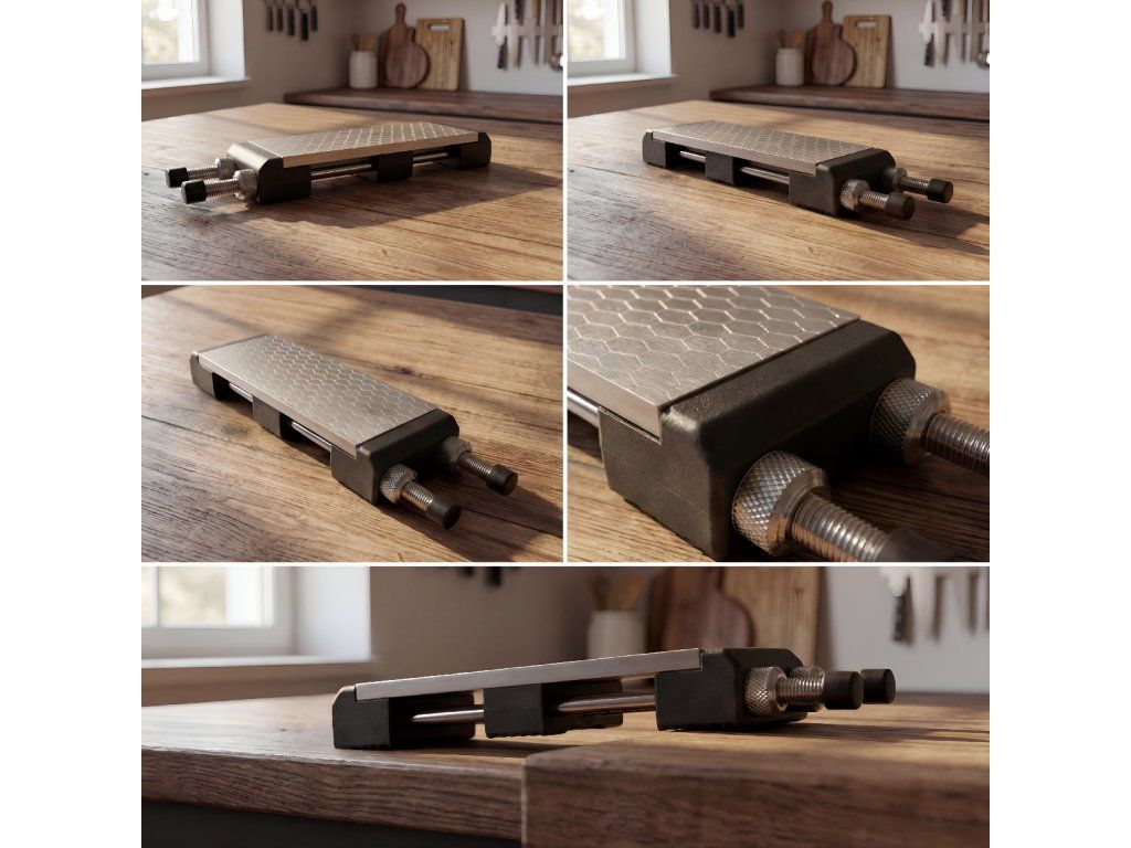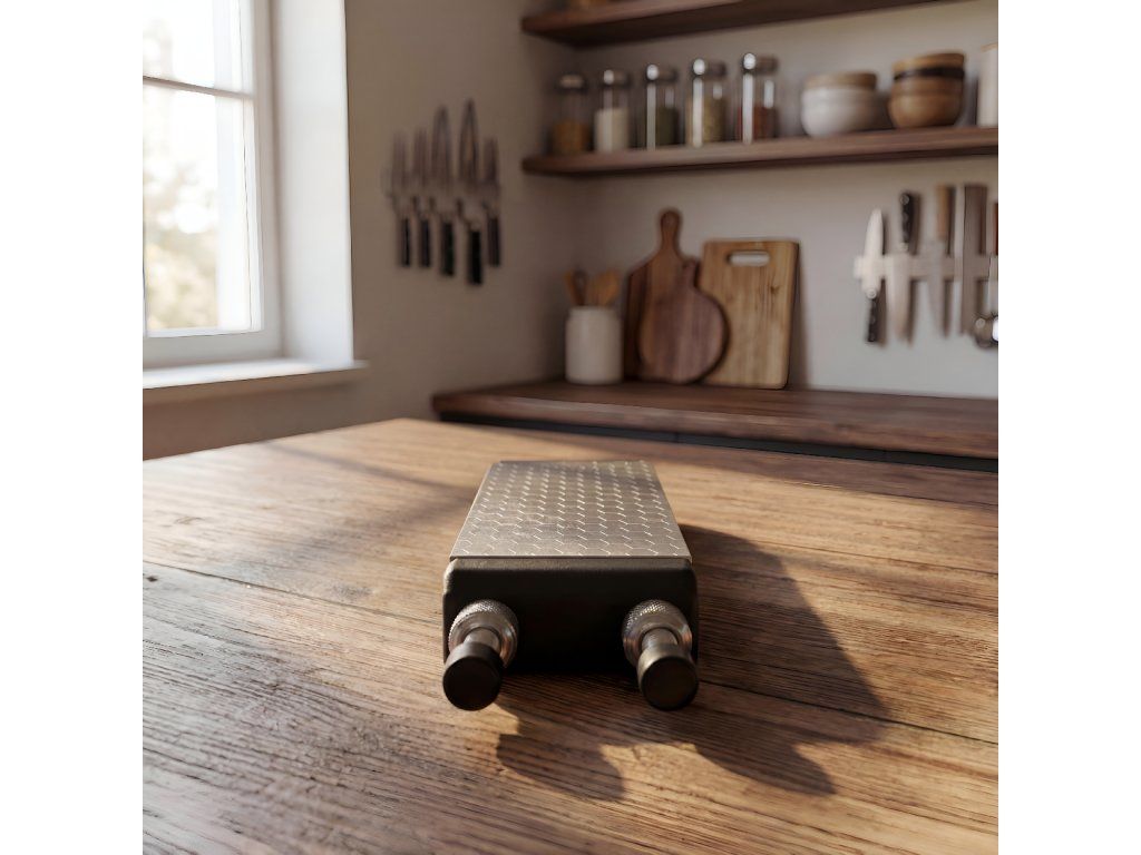 Bezpečnost a promyšlený design Diamantová brusná plocha s charakteristickým strukturovaným vzorem zajišťuje, že se obroušený kovový prach nehromadí na povrchu a nesnižuje efektivitu broušení. Samotný kámen je bezpečně usazen v robustní protiskluzové základně. Ta pevně drží na kuchyňské lince a dává vám stoprocentní jistotu, že vám brousek při tlaku neujede. Získáte tak profesionální a téměř nezničitelný nástroj, který bez kompromisů obslouží i ty nejtvrdší oceli.