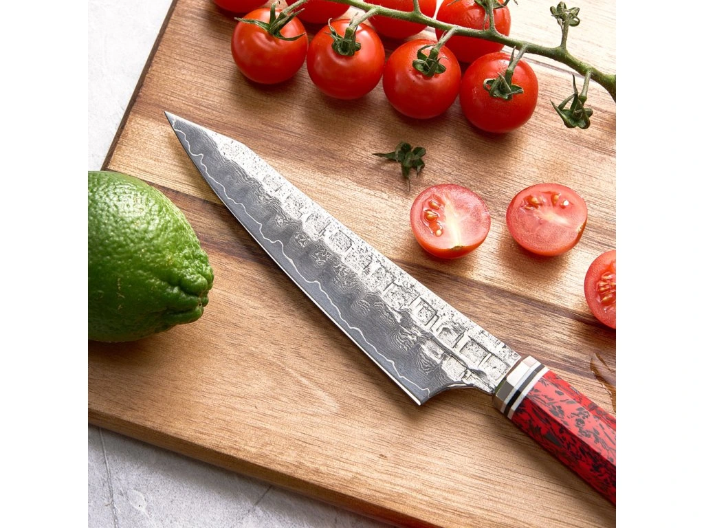 V menším těle se skrývá obrovská síla a technologická převaha. Tento 6palcový (15,2 cm) japonský malý víceúčelový nůž ze série Samurai Red Carbon spadá do ultraprémiové kategorie a je pravděpodobně tím nejpoužívanějším nástrojem, který budete ve své hi-tech výbavě mít. Každý kus je pečlivě ručně kovaný, čímž získává svou jedinečnou samurajskou duši. Jde o neuvěřitelně agilní a všestranný nástroj, ideální pro špikování masa, krájení menší zeleniny, sýrů nebo uzenin, kde je velký šéfkuchařský nůž příliš neohrabaný. Zakázková prášková ocel a 65 HRC Srdcem tohoto nože je exkluzivní zakázková prášková ocel 14Cr10MoW. Díky nejvyspělejší práškové metalurgii má ocel naprosto čistou a jemnou strukturu, která umožňuje kalení na extrémní tvrdost 65 ± 1 HRC. Tato bezprecedentní hodnota je ve světě nožů opravdovou vzácností a garantuje, že ostří zůstane děsivě ostré po neuvěřitelně dlouhou dobu i při každodenním nasazení. Extrémně tvrdé jádro je z obou stran zpevněno 67 vrstvami překládané damaškové oceli, která čepeli dodává potřebnou pružnost a vytváří uhrančivou, mramorovou kresbu. Inovativní rukojeť z červeného karbonu K ultraprémiové čepeli patří i odpovídající futuristická rukojeť. Tradiční materiály ustoupily hi-tech červenému karbonu. Uhlíková vlákna zalitá v odolné pryskyřici tvoří dechberoucí 3D texturu v sytě červených tónech a propůjčují noži sportovně-agresivní vzhled. Rukojeť z červeného karbonu je prakticky nezničitelná, dokonale odolává vlhkosti i nárazům a poskytuje maximální jistotu úchopu při detailní práci. Ruční brus pod úhlem 9–12° pak zaručuje, že tento japonský malý víceúčelový nůž hladce projde každou surovinou s naprostou přesností.