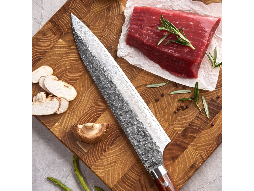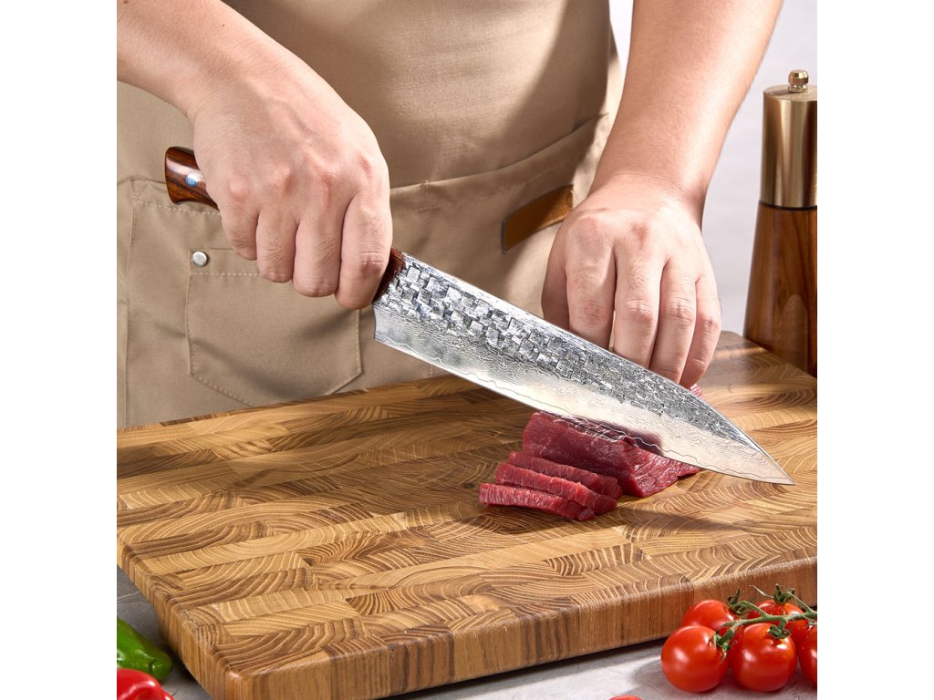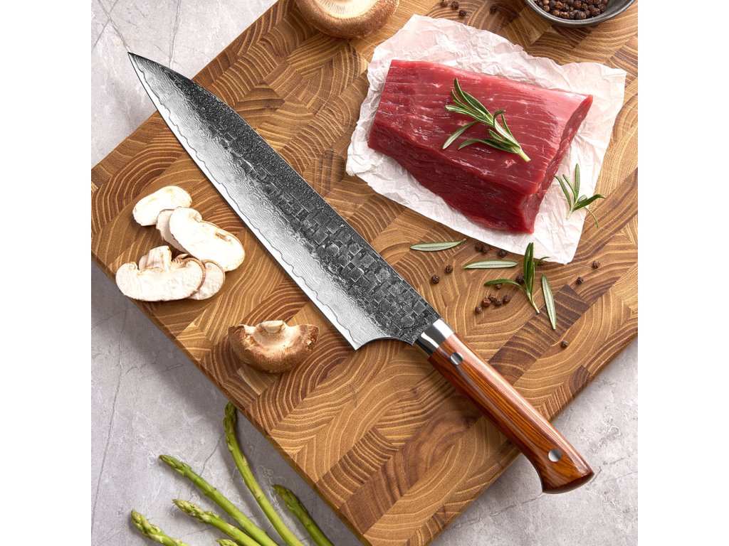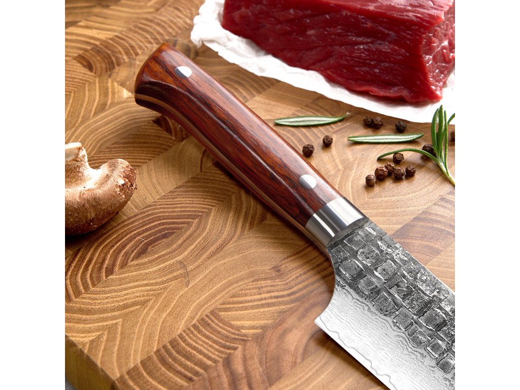 Vstupte do světa nekompromisní dokonalosti s tímto 9palcovým (22,9 cm) mistrovským dílem. Japonský nůž Gyuto ze série Samurai Palisandr spadá do ultraprémiové kategorie a představuje to nejlepší, co může moderní nožířství nabídnout. Je to všestranný šéfkuchařský nůž, se kterým je krájení masa, ryb i zeleniny naprostým vizuálním i hmatovým zážitkem. Každý kus je pečlivě ručně kovaný, čímž získává svou jedinečnou duši a nezničitelný charakter hodný opravdového samuraje. Zakázková prášková ocel a 65 HRC Srdcem tohoto nože je exkluzivní zakázková prášková ocel 14Cr10MoW. Díky pokročilé práškové metalurgii má ocel dokonale čistou a jemnou strukturu, která umožňuje zakalení na extrémní tvrdost 65 ± 1 HRC. Tato bezprecedentní hodnota zaručuje, že ostří vydrží chirurgicky ostré násobně déle než u běžných prémiových nožů. Damašková ocel a palisandrové dřevo Mimořádně tvrdé jádro je z obou stran chráněno 67 vrstvami překládané damaškové oceli. Ta čepeli dodává potřebnou pružnost a vytváří na jejím povrchu neopakovatelný mramorový vzor. Tuto technologickou dokonalost doplňuje luxusní rukojeť z ušlechtilého palisandrového dřeva. Palisandr je ceněný pro svou obrovskou tvrdost, dlouhověkost a nádhernou sytou barvu s temnou kresbou, která v ruce působí neuvěřitelně majestátně a hřejivě.