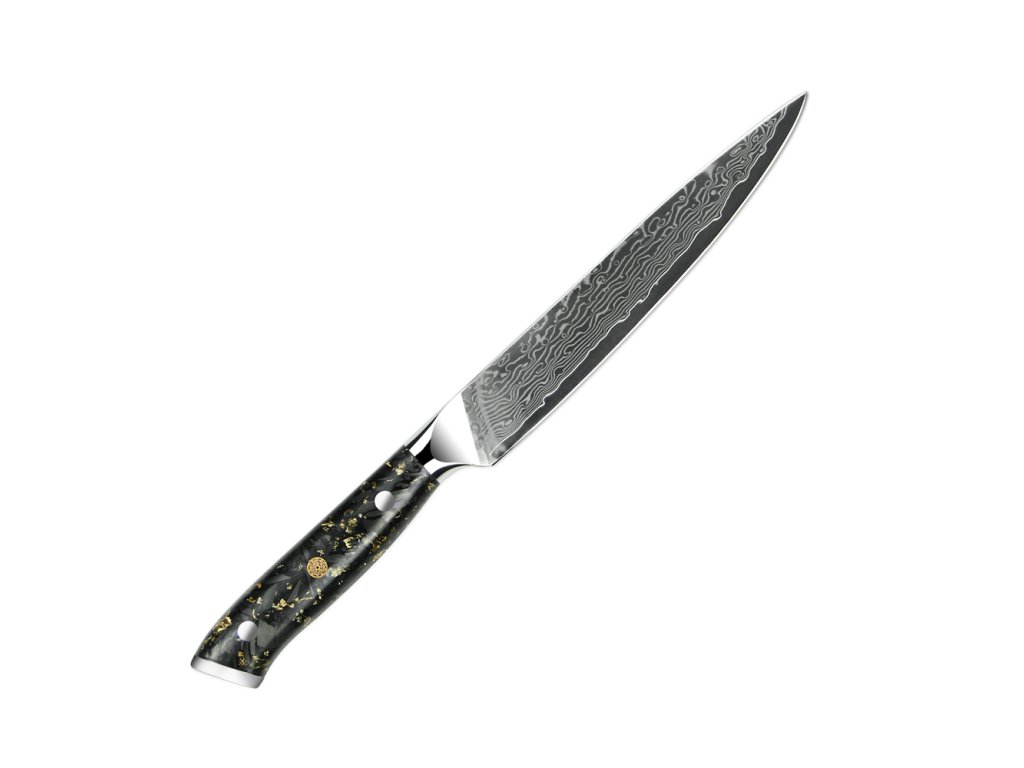 Tento malý víceúčelový nůž (Utility knife) ze série Samurai Carbon Gold je nepostradatelným pomocníkem tam, kde je velký kuchařský nůž příliš neohrabaný. S délkou čepele 6 palců (15,2 cm) nabízí dokonalou kontrolu a obratnost. Je to ideální nástroj pro loupání ovoce, odblaňování masa, krájení menší zeleniny, špikovány nebo přípravu svačin.