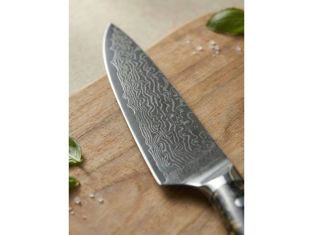 Damašková ocel a tvrdost 60±2 HRC Stejně jako jeho větší bratři, i tento nůž má čepel s ultra tvrdým jádrem z japonské oceli VG10 (60±2 HRC). To zajišťuje, že ostří vydrží brutálně ostré i při častém používání. Jádro je chráněno 67 vrstvami překládané damaškové oceli, která vytváří na čepeli nádhernou unikátní kresbu.