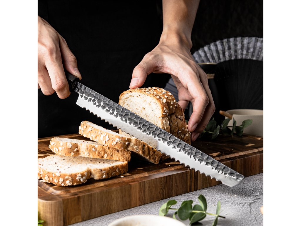 Rukojeť je navržena v temném, elegantním provedení Black Forget, což noži dodává moderní, profesionální vzhled. Ergonomický design rukojeti zajišťuje pohodlné držení i při delším krájení větších bochníků. Vyváženost konstrukce pomáhá udržet kontrolu a minimalizuje únavu při práci.