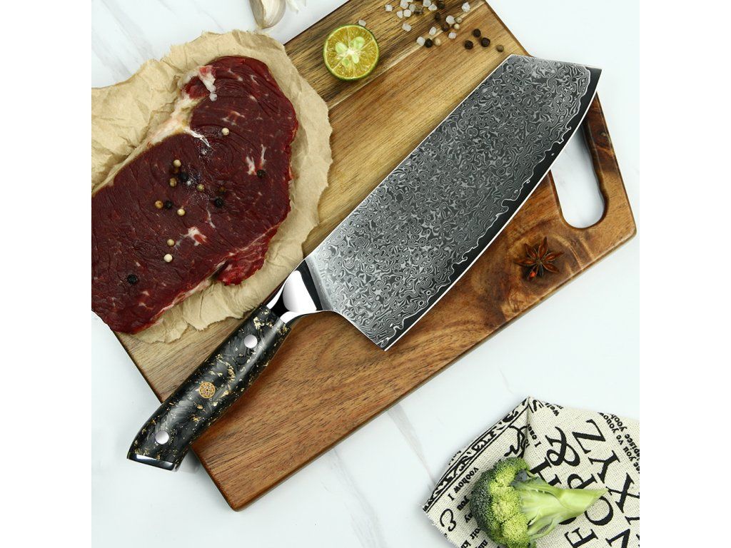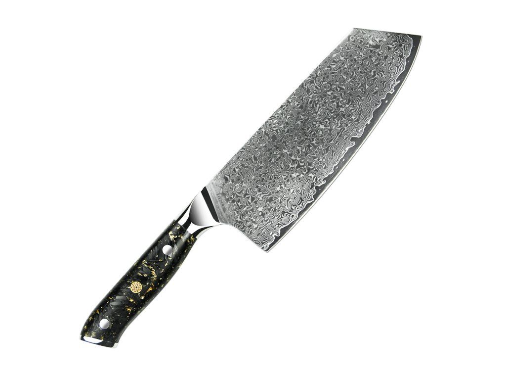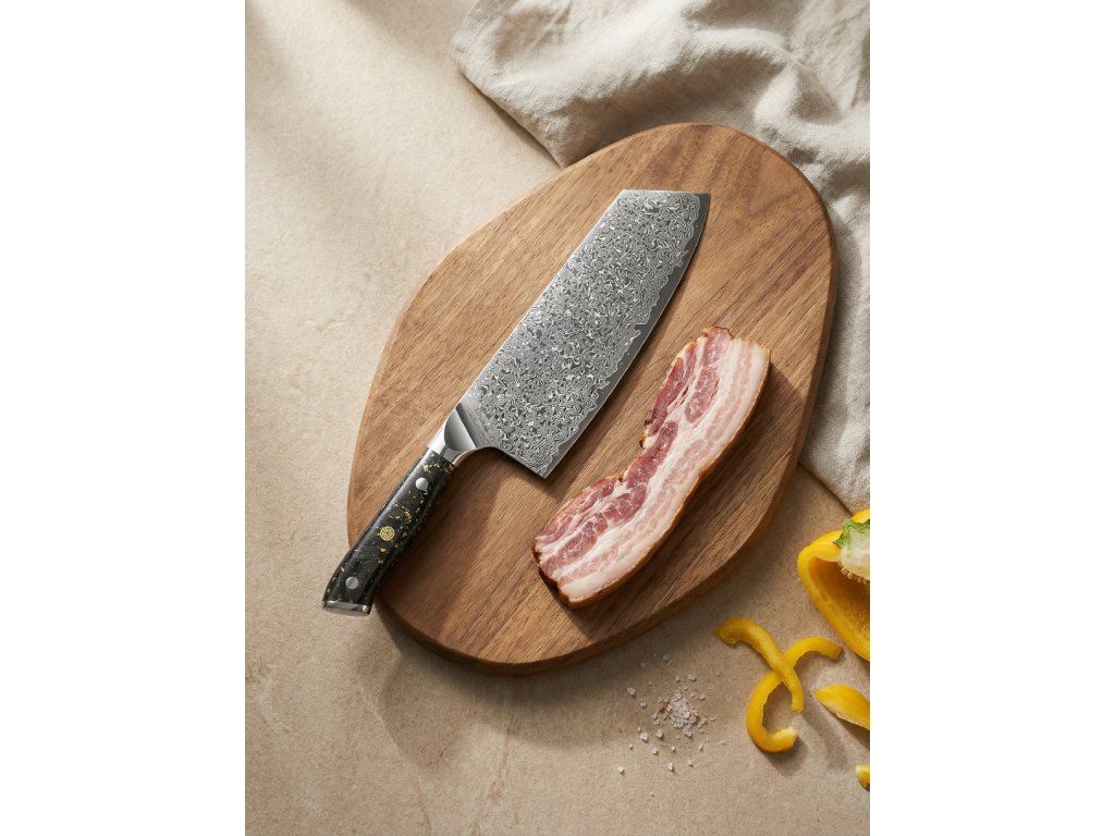 Tento 7,5palcový (19 cm) sekáček ze série Samurai Carbon Gold mění pravidla hry. Není to tupý nástroj na drcení kostí, jak ho znáte z běžných sad. Je to sofistikovaný, extrémně ostrý nástroj typu "Chinese Chef Knife", který kombinuje váhu sekáčku s ostrostí břitvy. Je dokonalý na krájení velkých kusů masa, krouhání zelí, drcení česneku plochou čepele nebo přenášení surovin do hrnce.
