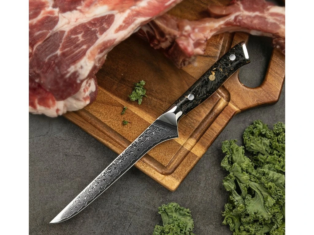 Luxusní rukojeť: Karbon a zlato Práce s masem bývá náročná, proto je rukojeť tohoto nože Samurai navržena s důrazem na ergonomii a styl. Tvoří ji lehká karbonová vlákna se zalisovanými zlatými šupinami. Materiál je odolný, nenasakuje vlhkost ani pachy a v ruce sedí naprosto jistě, což je při vykošťování klíčové.