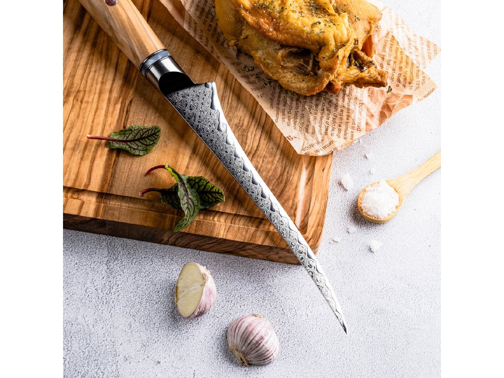 Tento nůž je navržen speciálně pro práci s masem, kde je potřeba maximální přesnost. Úzká a ostrá čepel umožňuje vést řez těsně u kosti, oddělovat maso od chrupavek a šlach, aniž by docházelo k plýtvání. Vícevrstvá konstrukce z 67 vrstev damaškové oceli zajišťuje vysokou pevnost, odolnost a vynikající držení ostří.