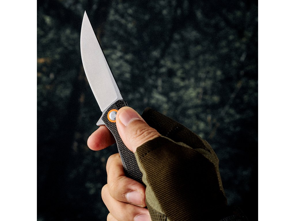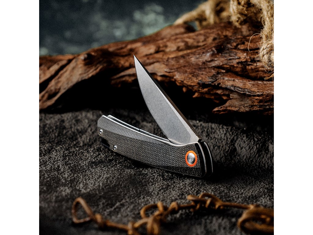 Rukojeť je vyrobena z mikarty, kompozitního materiálu tvořeného tkaninou slisovanou s pryskyřicí. Mikarta je extrémně odolná vůči vlhkosti, nárazům i teplotním změnám a zároveň poskytuje jistý a komfortní úchop, který neklouže ani za mokra. To z ní dělá jeden z nejlepších materiálů pro outdoorové a pracovní nože.
